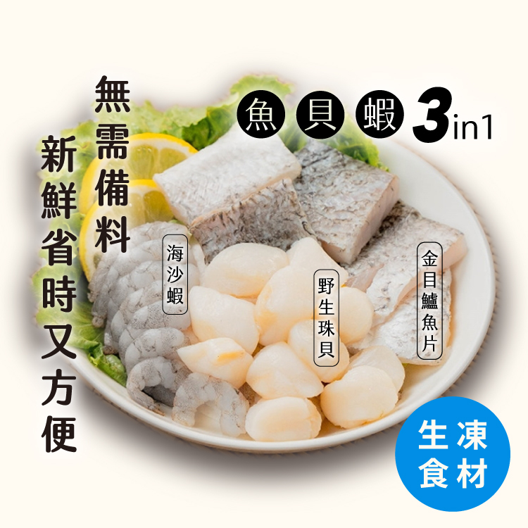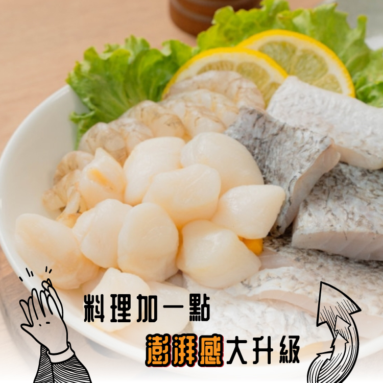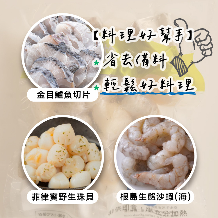 【成份】金目鱸魚片+野生珠貝+根島海沙蝦仁